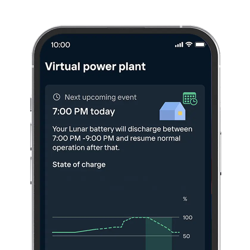 When the grid needs power, it pays for yours. Virtual Power Plant programs connect your battery to the grid during peak demand — and cut you a check for showing up. Enroll in minutes, right in the Lunar App.