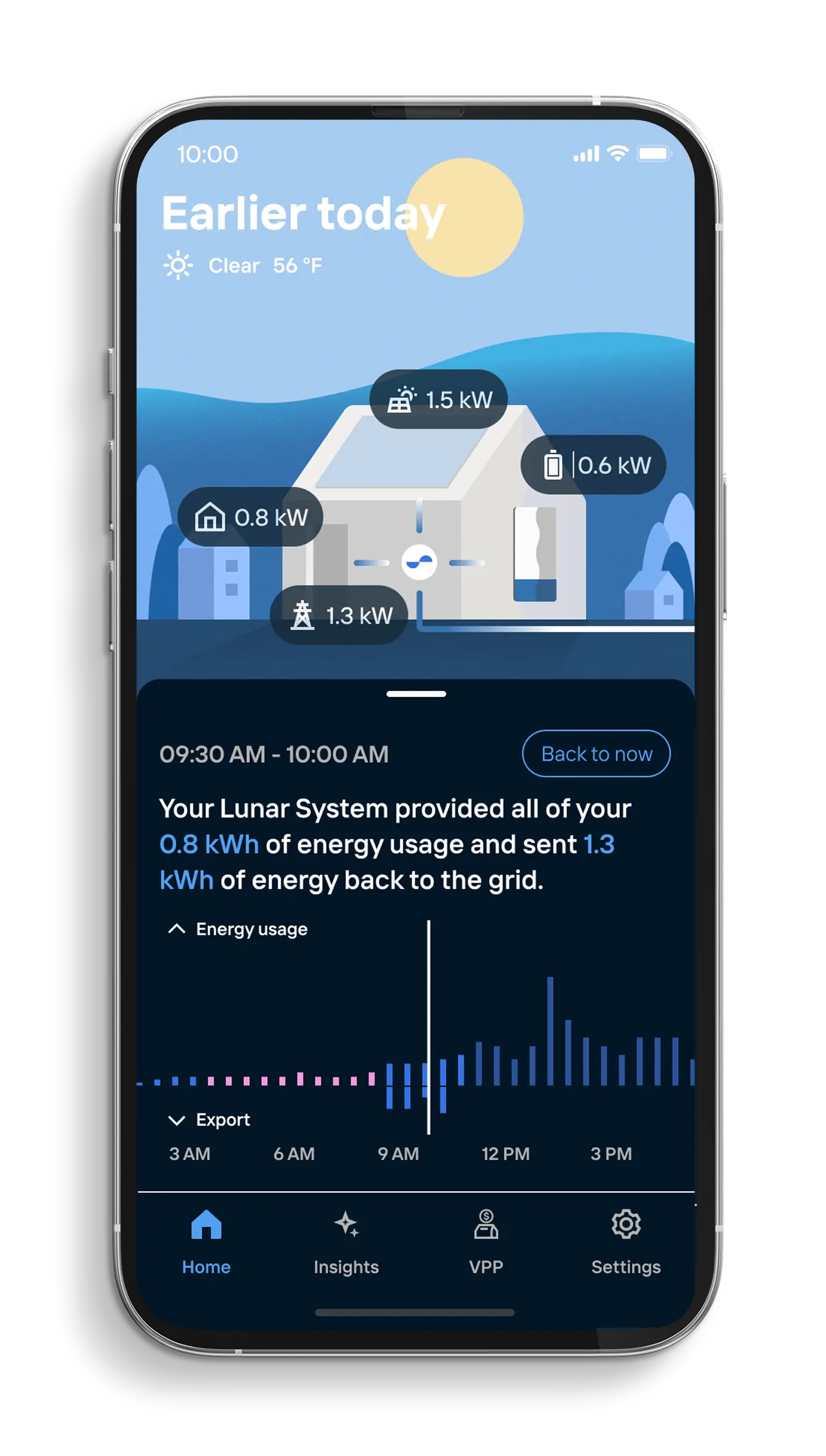 The Lunar App gives you a live window into all the energy your home is making, using, and saving for later. Not because you need to manage it — because it feels good to know.