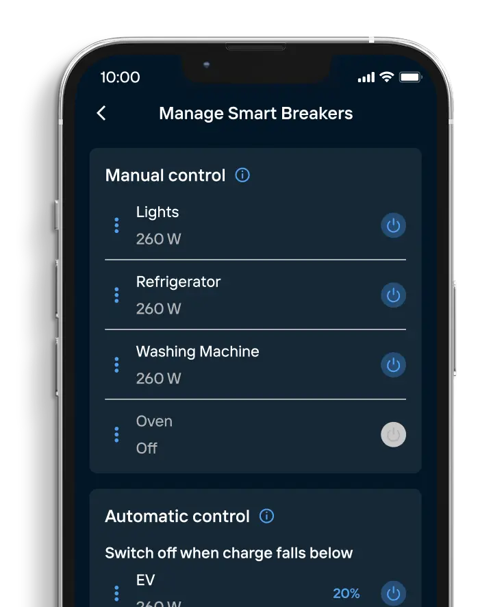 With integrated smart breakers from Eaton, critical appliances stay on. Everything else steps aside. As you make each call, a live readout shows exactly how much longer your energy will last.