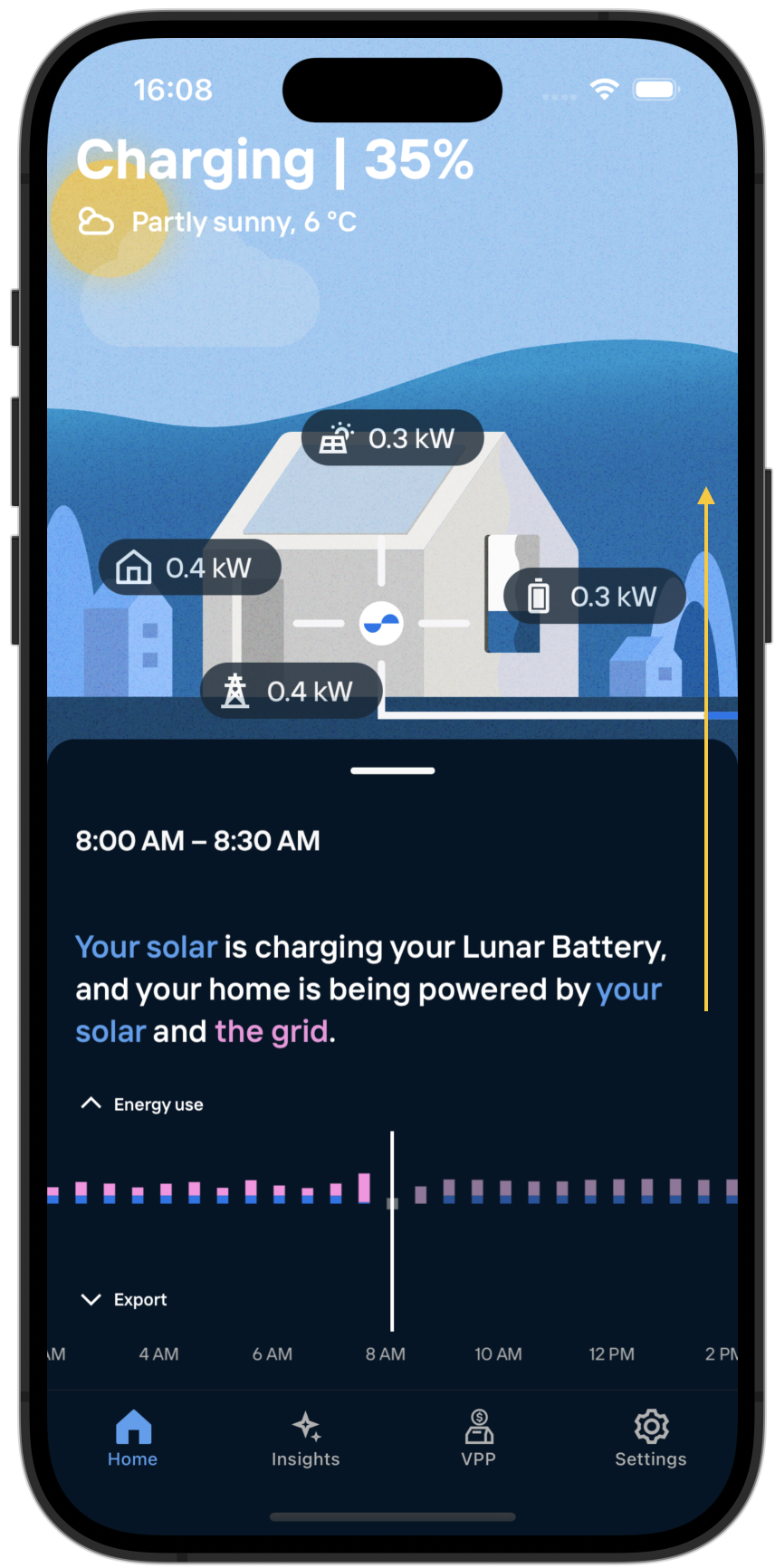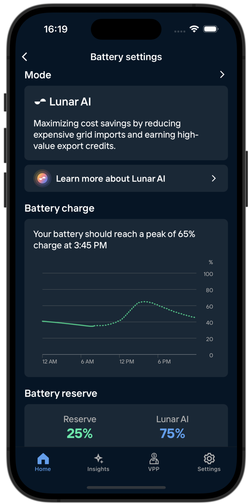 This mode uses Lunar’s proprietary AI to maximize your cost savings and bill credits, as well as making use of your home-made energy.