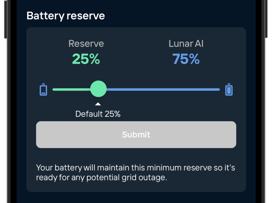 Visit battery settings to view your battery reserve. To adjust (if allowed by your installer) drag the green circle to your desired percentage and tap “Submit”.