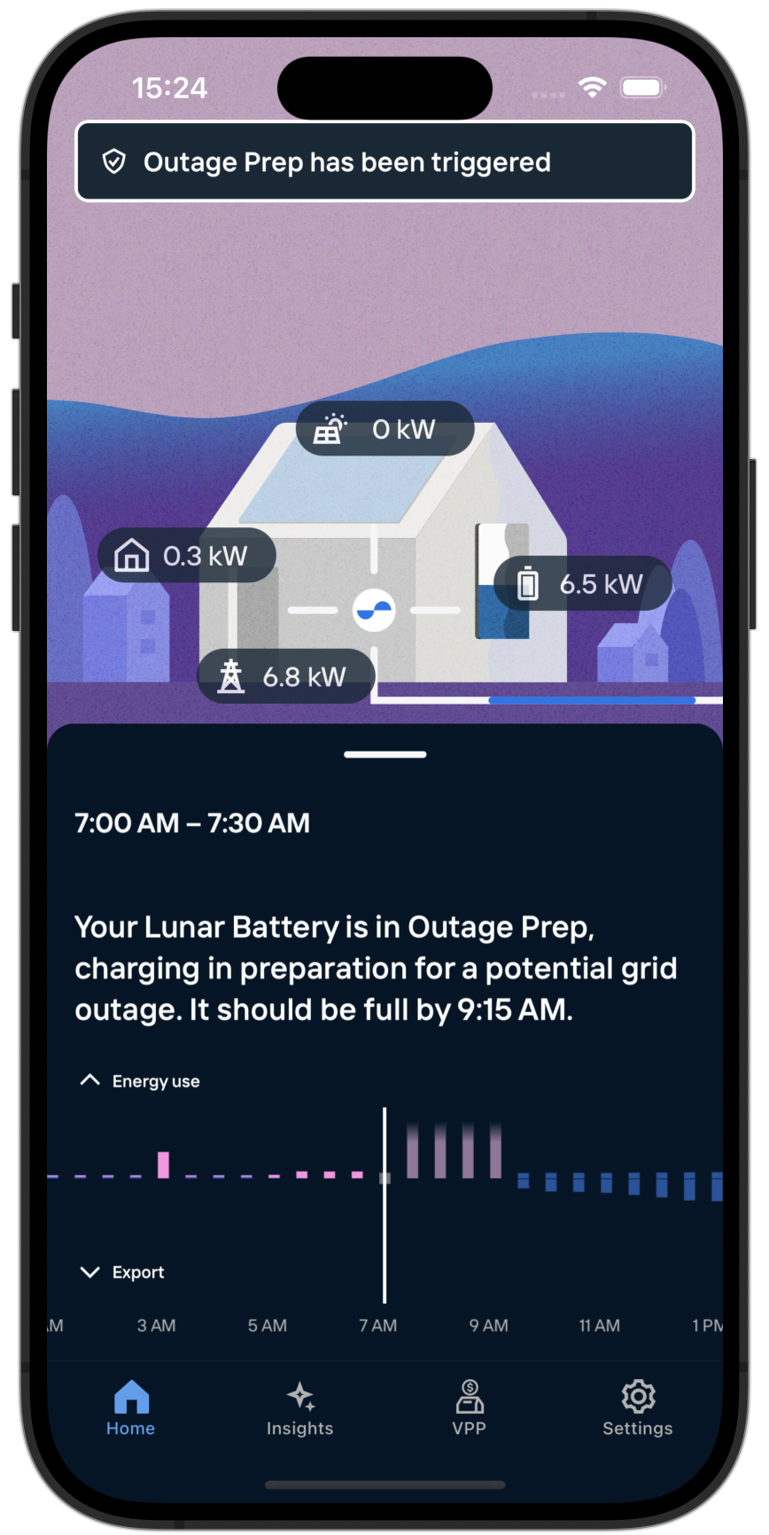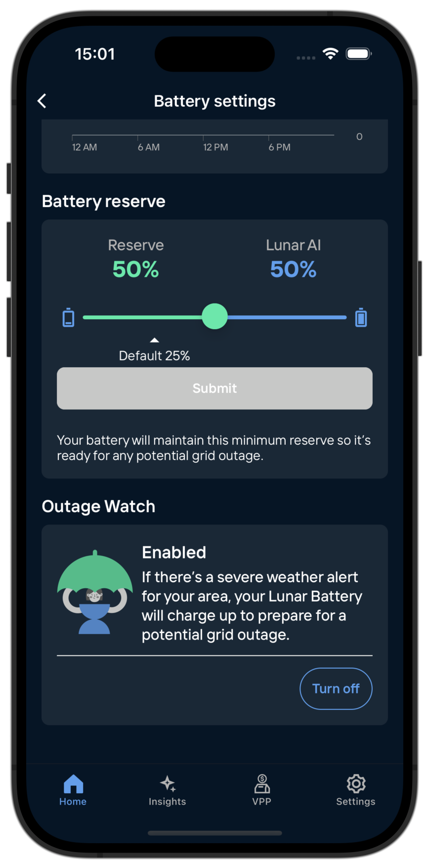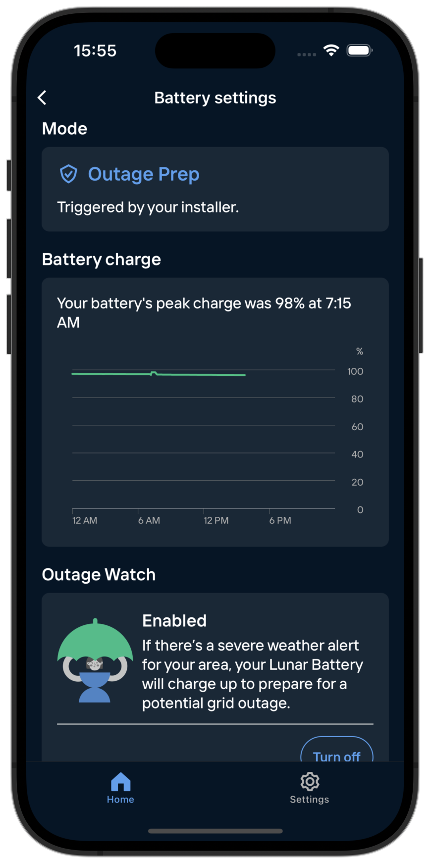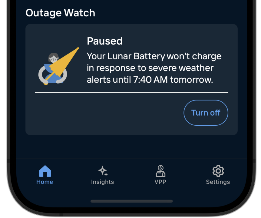 This setting automatically prepares your Lunar Battery for a potential grid outage caused by severe weather. You can find it at the bottom of the battery settings page.